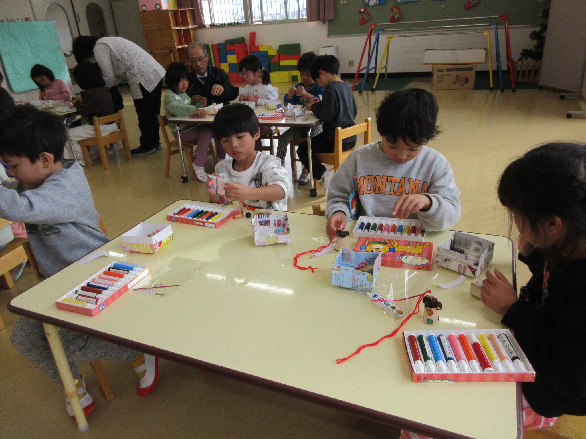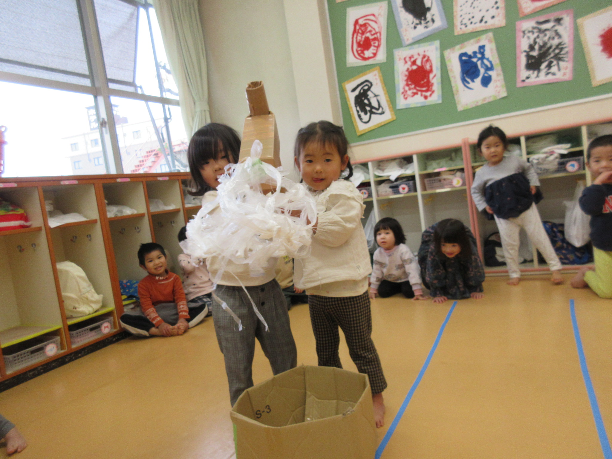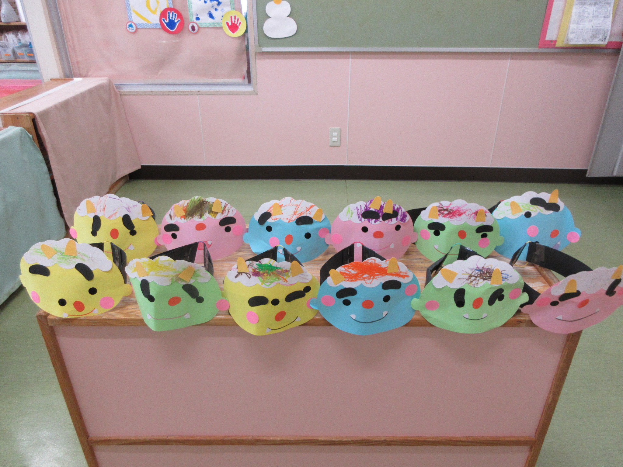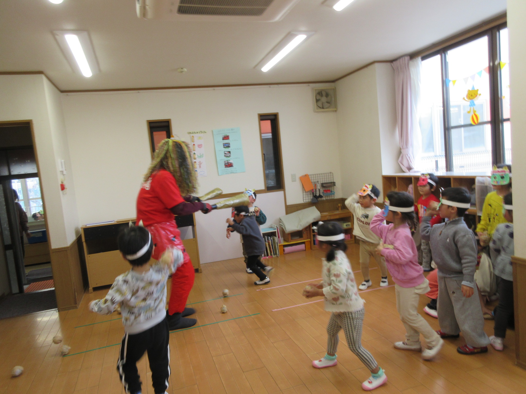 | 春を告げる節分の行事。鬼の面作りや豆まきの練習など準備を進めてきた子ども達。みんな揃ってのつどいで節分の由来のお話を聞いたり、5歳児がリードして『鬼のパンツ』の手遊びを楽しんだりして、いよいよ豆まきタイムがやって来ました。 心の中の色々な鬼をやっつけようと豆まきを始めると・・・ 鬼の登場に小さい組では職員の後ろに逃げ込んで隠れてしまう子も見られましたが、4・5歳児は怖さにひるまず特製の豆を投げつけ、見事に鬼が退散!! 給食では手作りの巻きずしをたくさん味わい、みんな満足そうでした。 |
