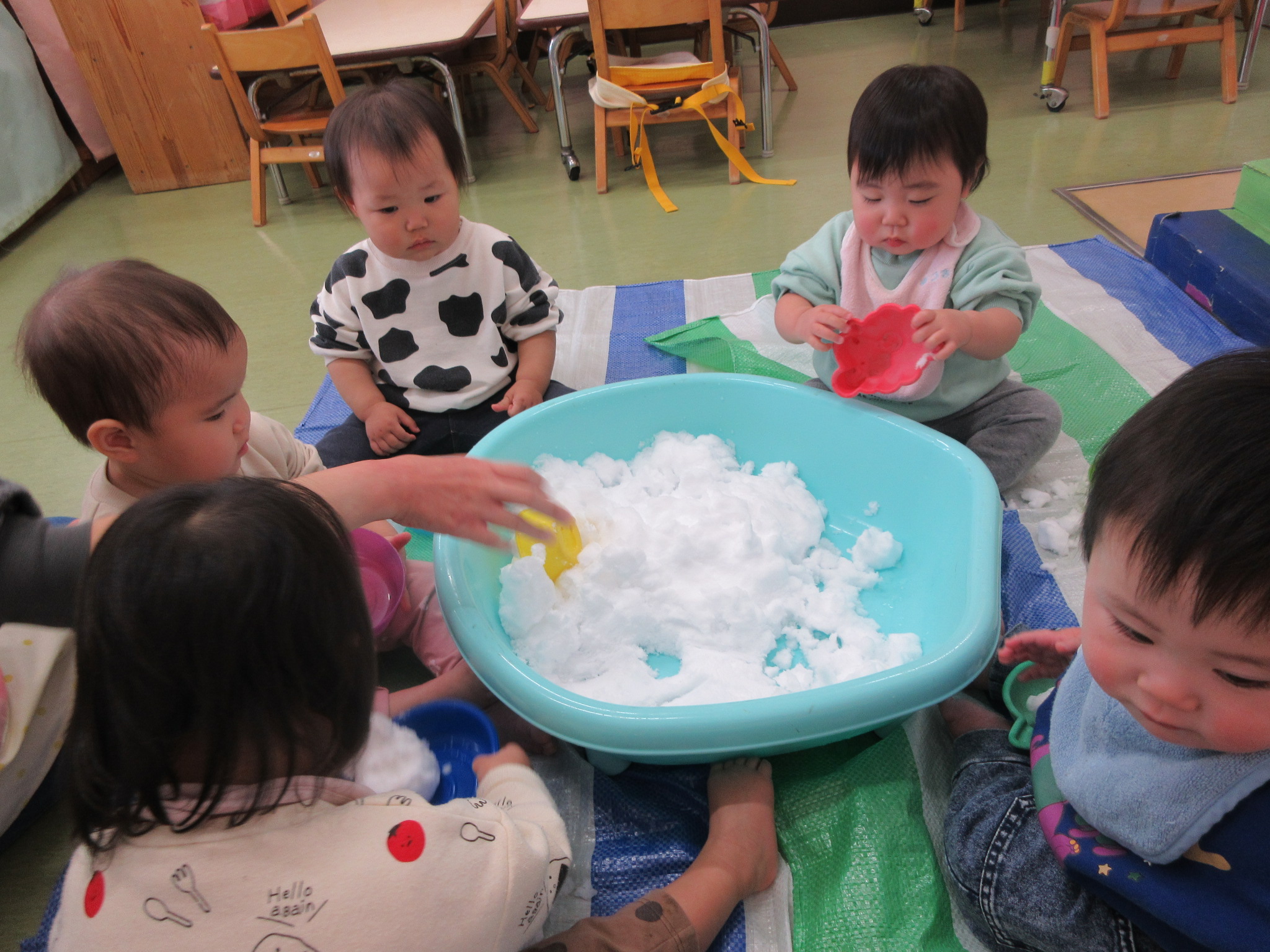 | 今年もたくさん雪が降りました。雪あそびを待ちかねていた子ども達は、寒さや冷たさを吹き飛ばして元気いっぱい、園庭や広場を駆けまわって新雪の感触を楽しんでいました。日に日に雪だるまや雪山の滑り台、かまくらなどが増えて大満足の様子でした。 | ||