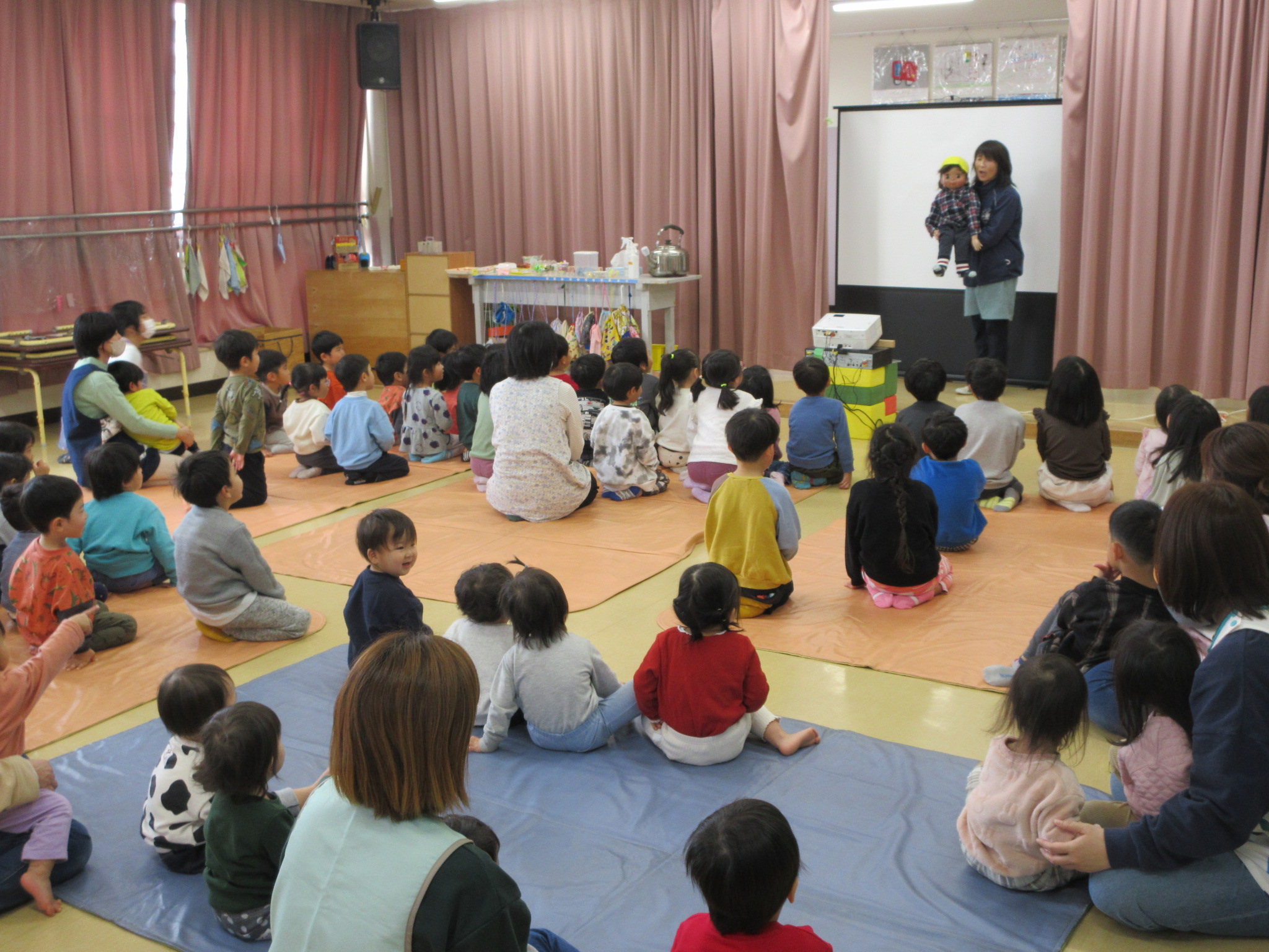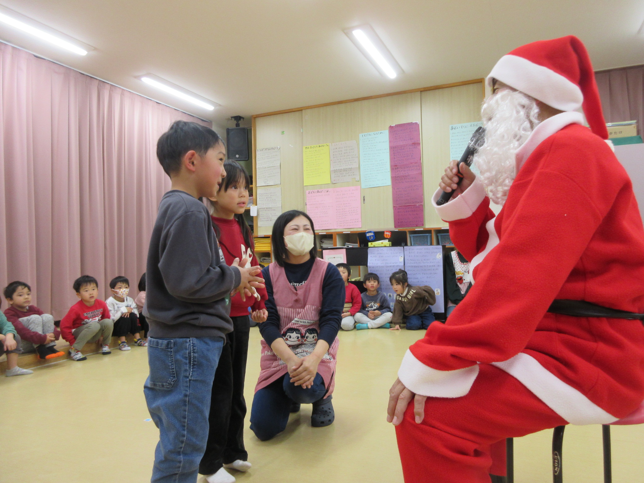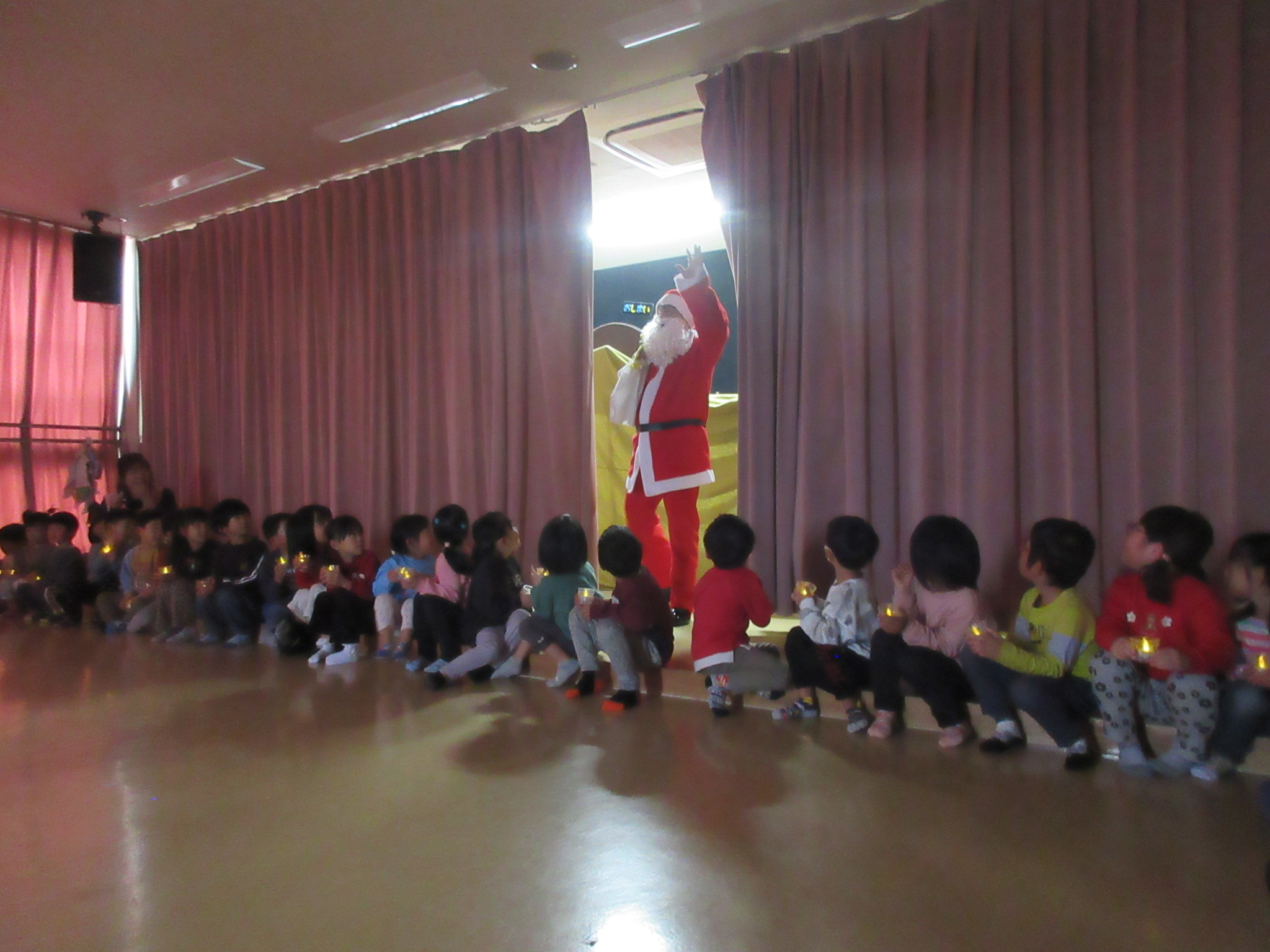 | 交通安全教室 手品や絵合わせゲーム、お待ちかねのケンちゃんの登場など楽しく交通安全について学び、横断歩道の渡り方を練習したりペンダントの製作あそびを楽しんだりしました。 クリスマス会 今年も人形劇団に来て頂き、地域のお友達と一緒にお話や歌遊びの人形劇を楽しみました。キャンドルサービスを目印にサンタさんがやってきてくれ、一緒に歌を歌ったりインタビューをしたり、プレゼントを貰ったりして楽しい一時を過ごしました。 |
