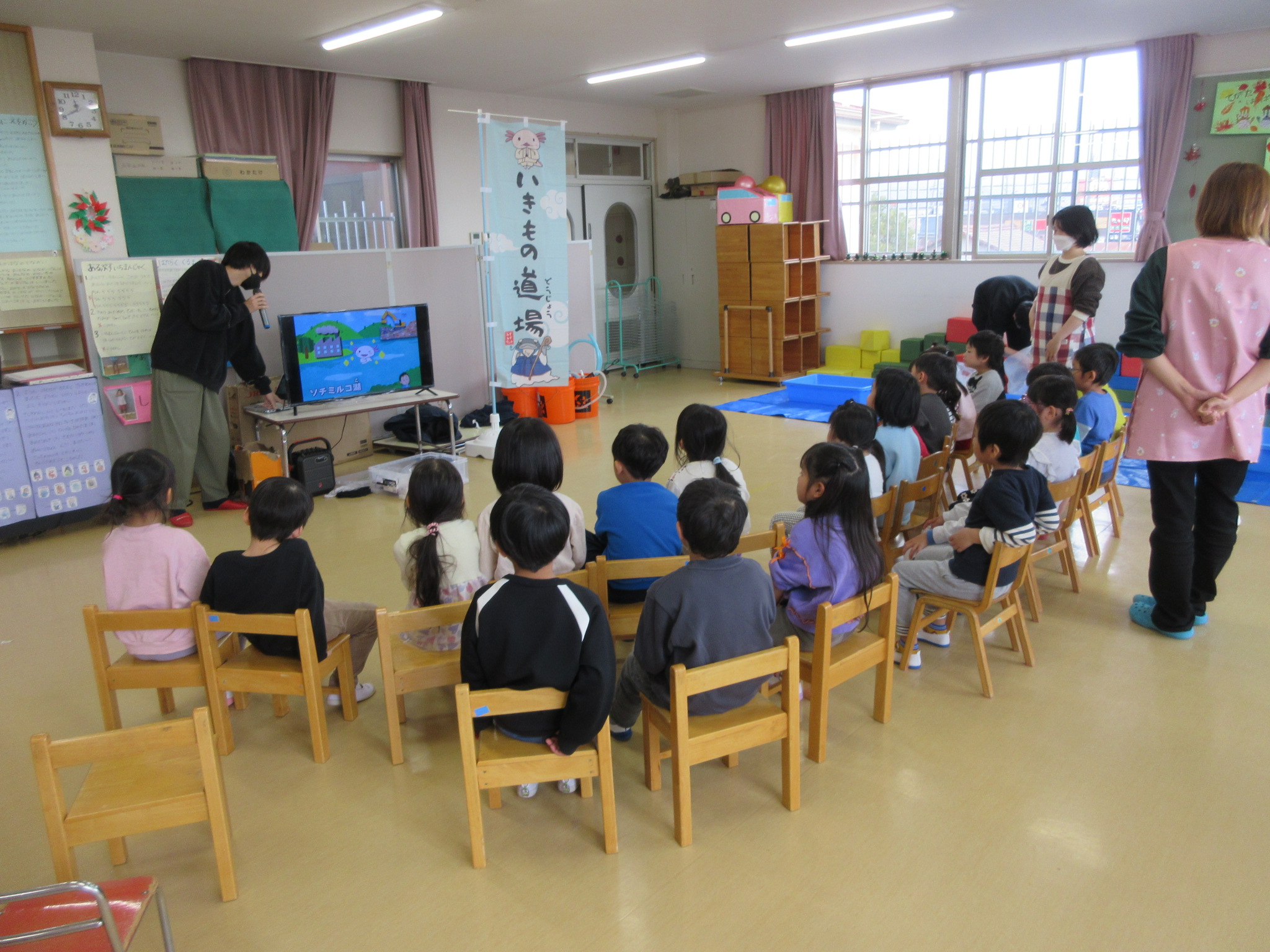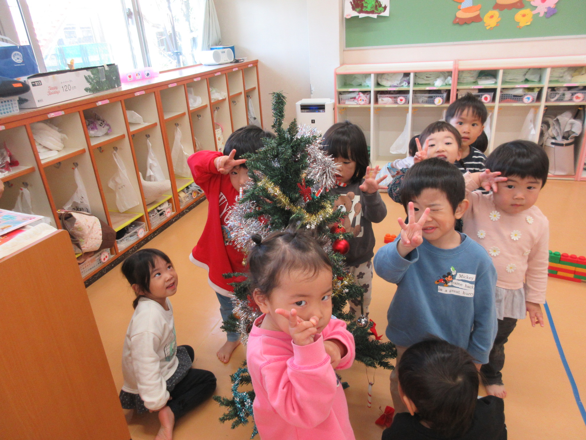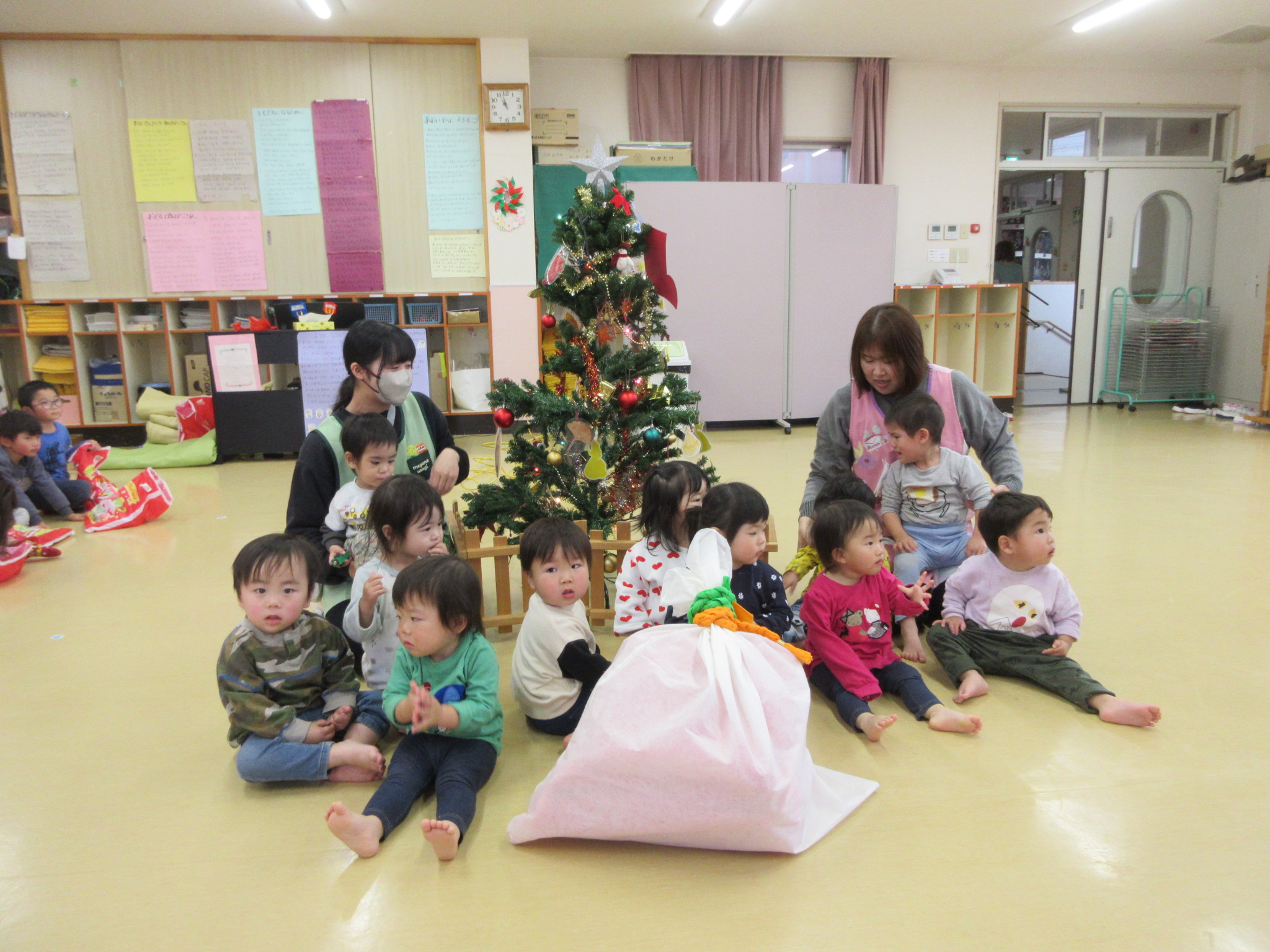 | 交通安全教室 手品や絵合わせゲーム、お待ちかねのケンちゃんの登場など楽しく交通安全について学び、横断歩道の渡り方を練習したりペンダントの製作あそびを楽しんだりしました。 クリスマス会 今年も人形劇団に来て頂き、地域のお友達と一緒にお話や歌遊びの人形劇を楽しみました。キャンドルサービスを目印にサンタさんがやってきてくれ、一緒に歌を歌ったりインタビューをしたり、プレゼントを貰ったりして楽しい一時を過ごしました。 |