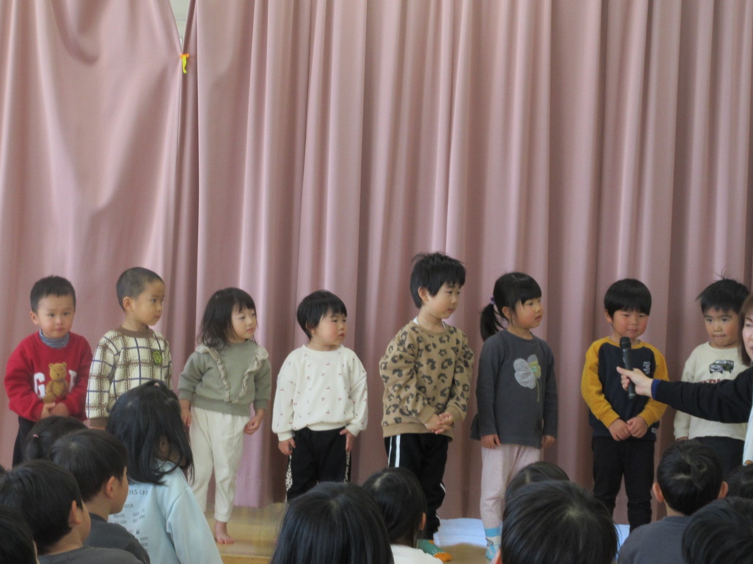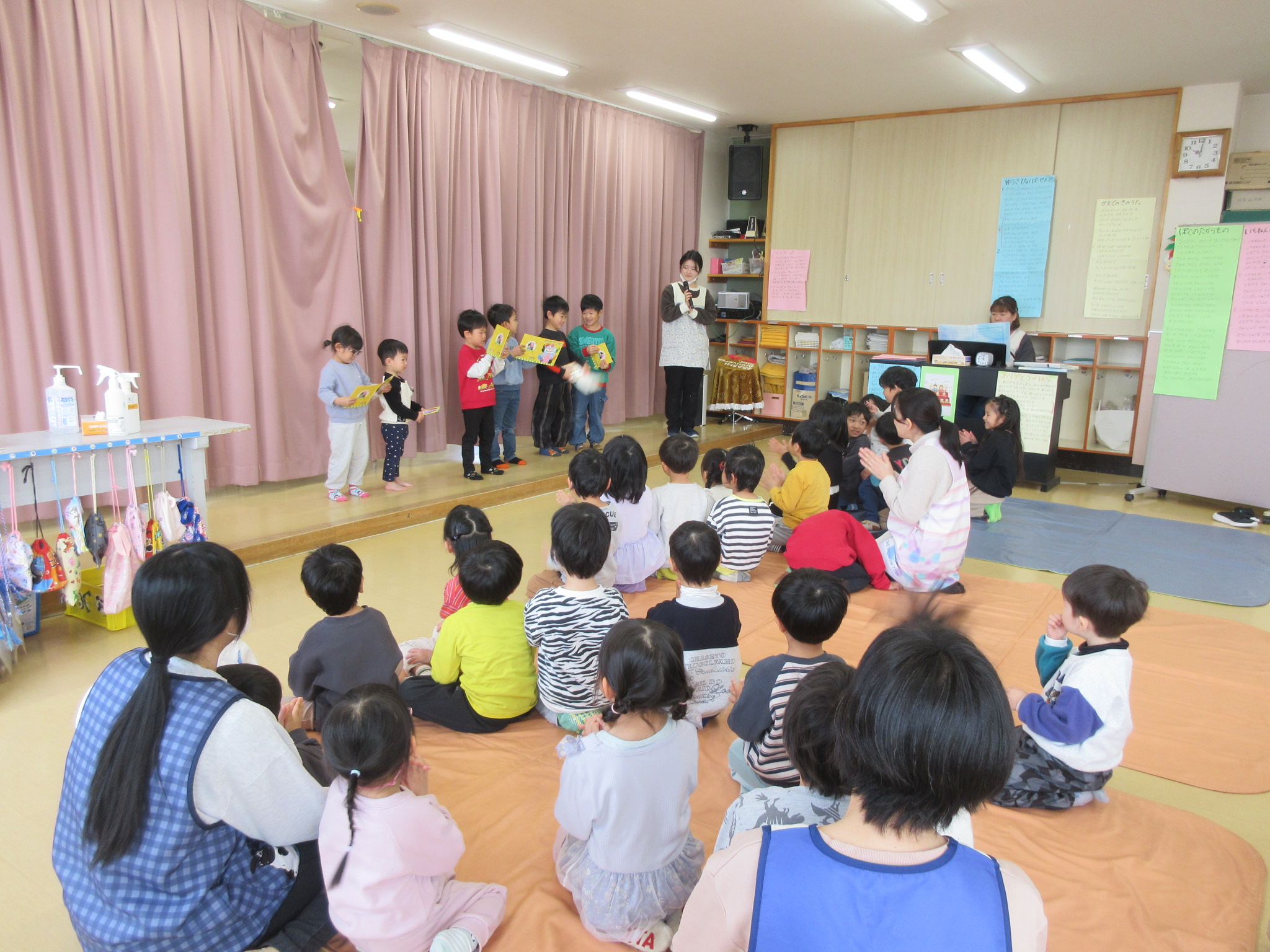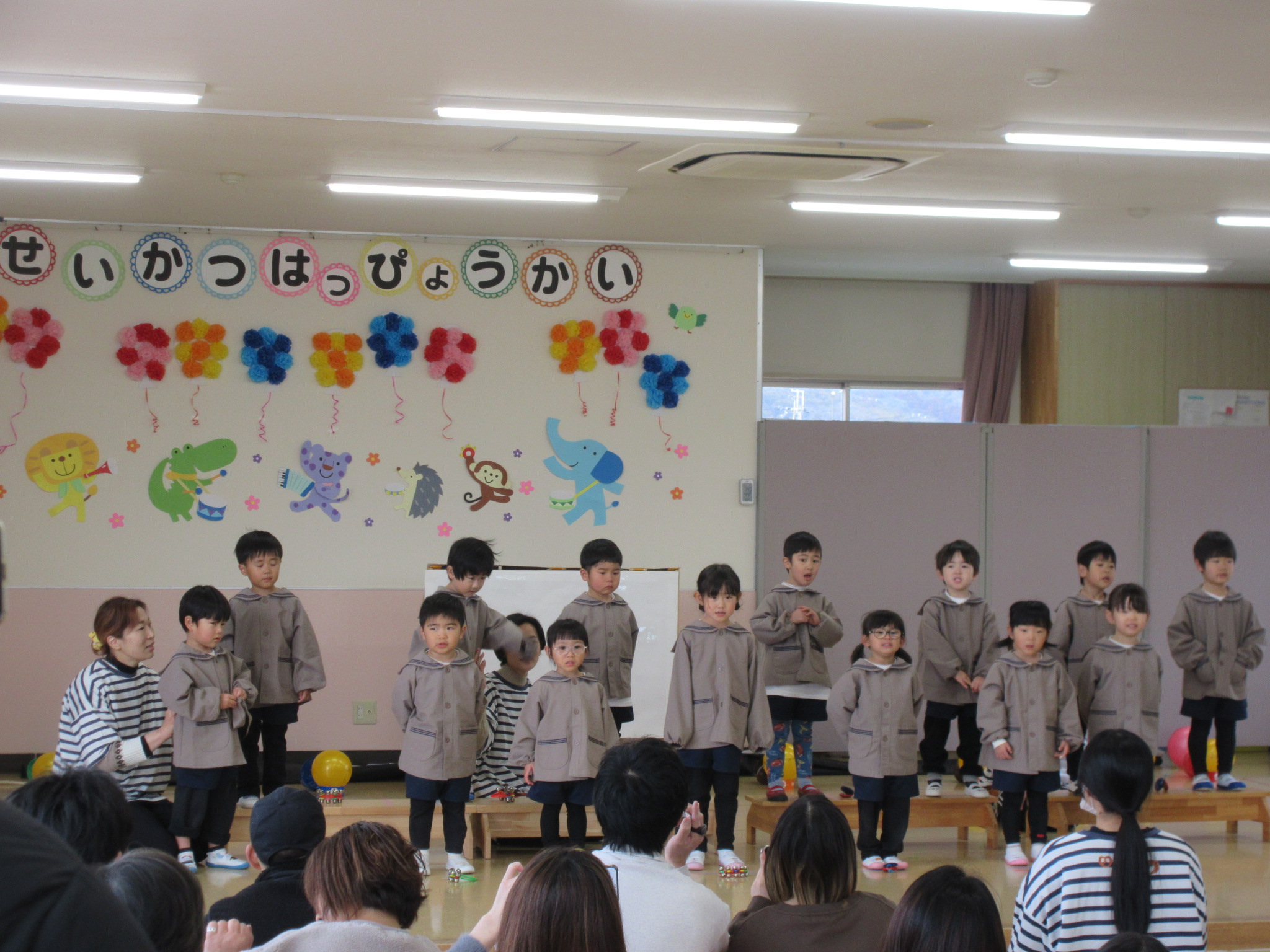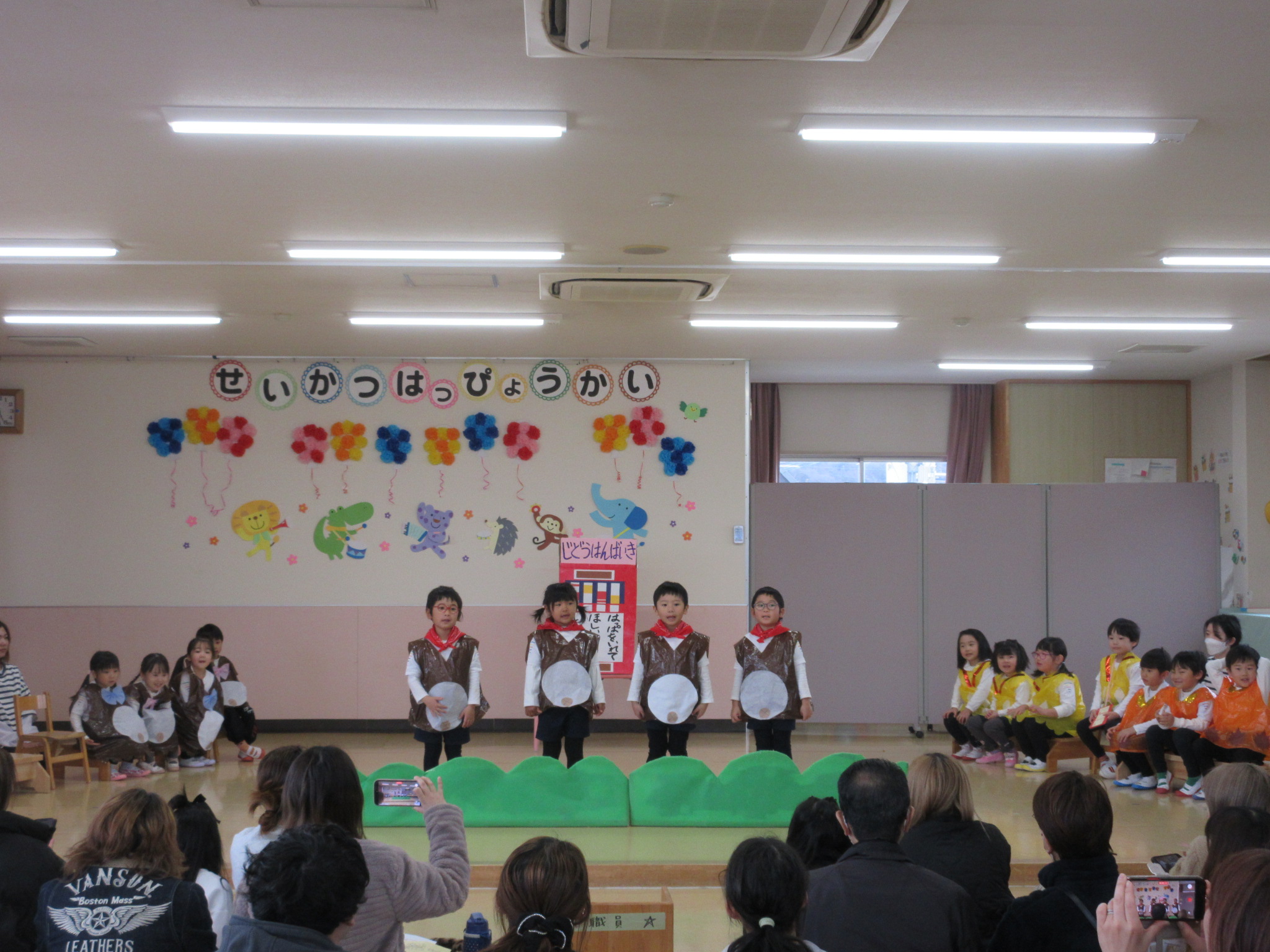 | 第1部3歳児、第2部4・5歳児に分かれて、子ども達の一年間の成長振りと、日頃の保育の取り組みの様子をお家の方の前で発表しました。 3歳児は、初めての舞台発表に不安そうな様子で登園する子も見られましたが、幕が上がると笑顔が増えだし、徐々に緊張や不安も吹き飛び生き生きと元気一杯発表する事が出来ました。 4・5歳児は、少しずつ難しい事に挑戦し、準備や道具作りなど色々な経験を通して自信を高めて発表の日を迎えました。得意なこと、苦手だけど頑張った事、それぞれの達成感を味わいながらしっかりと発表する事が出来ました。 プログラムの修了後、5歳児が『終わりの言葉』で保育園生活最後の発表会を締めくくってくれました。 |