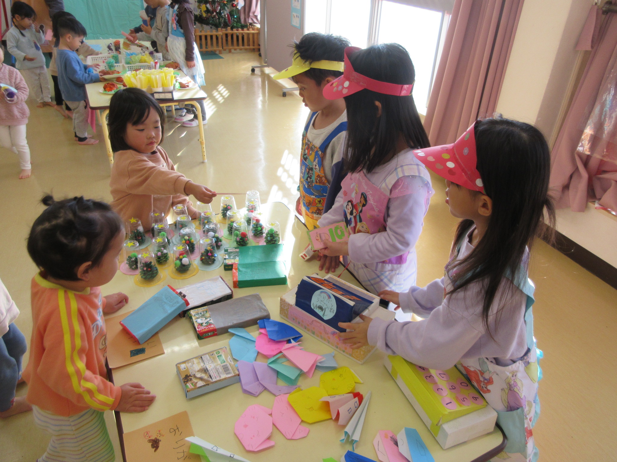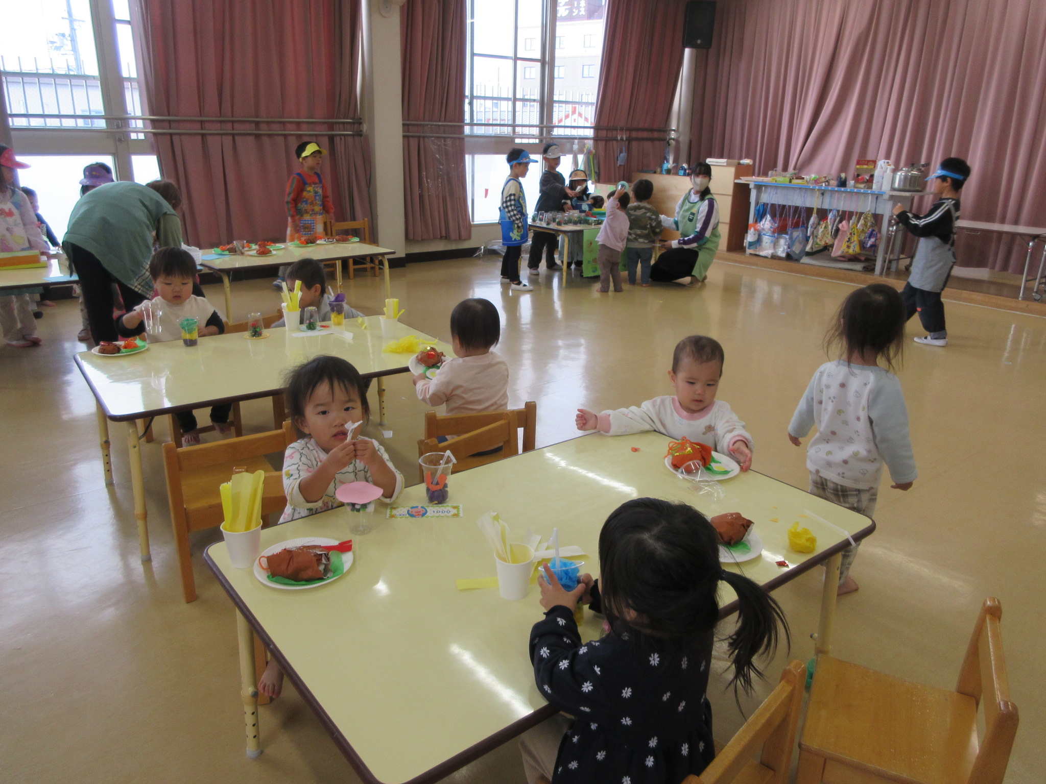 | 5歳児が準備を進めていたお店屋さんが開店しました。レストラン、おもちゃ屋さん、ゲームコーナーと工夫を凝らし、看板やレジ、お金も作り小さい組を招待しました。いらっしゃいませ~! いかがですか~? ありがとうございま~す! と元気一杯、張り切ってお客さんを迎えていました。 | ||