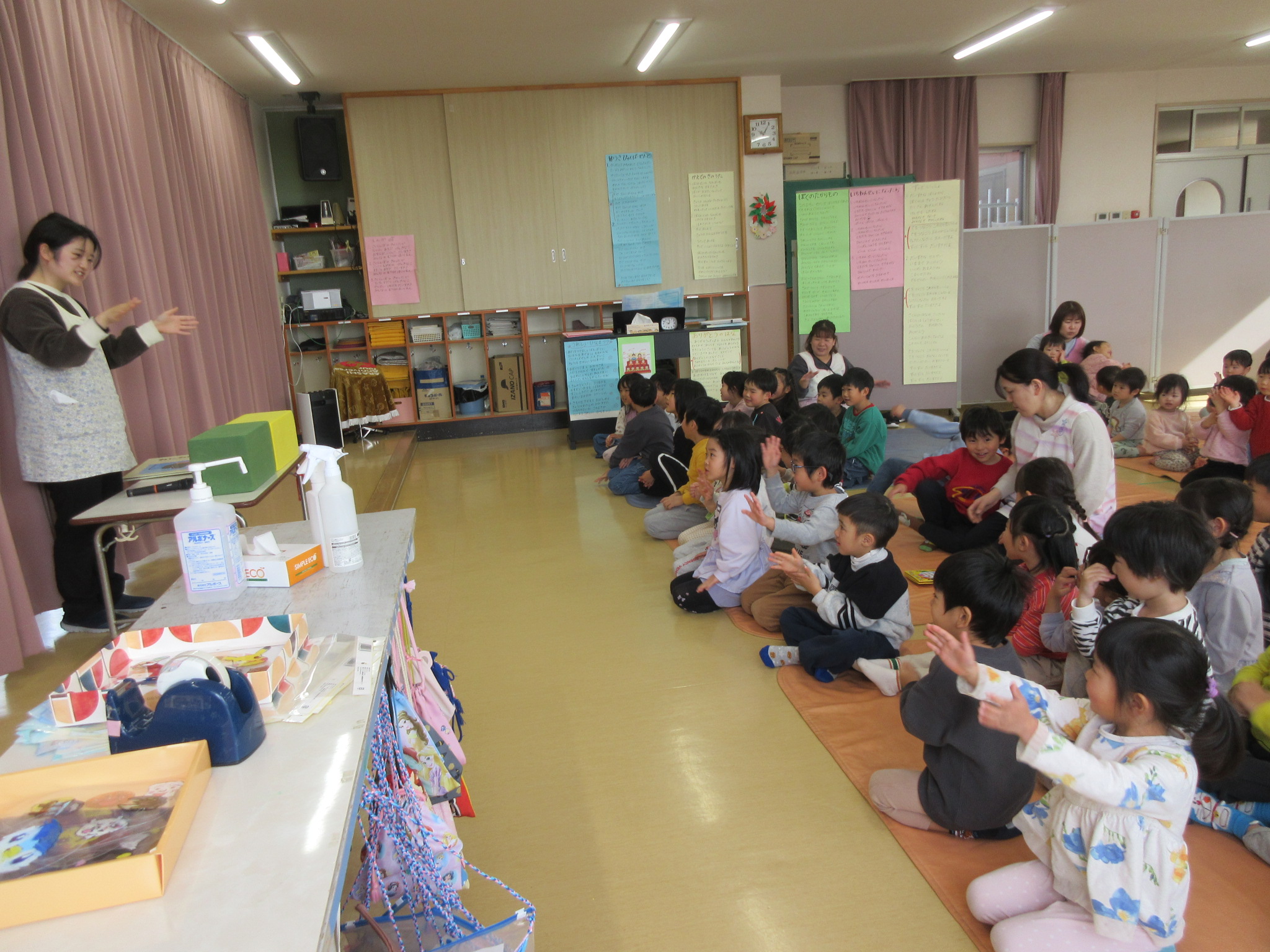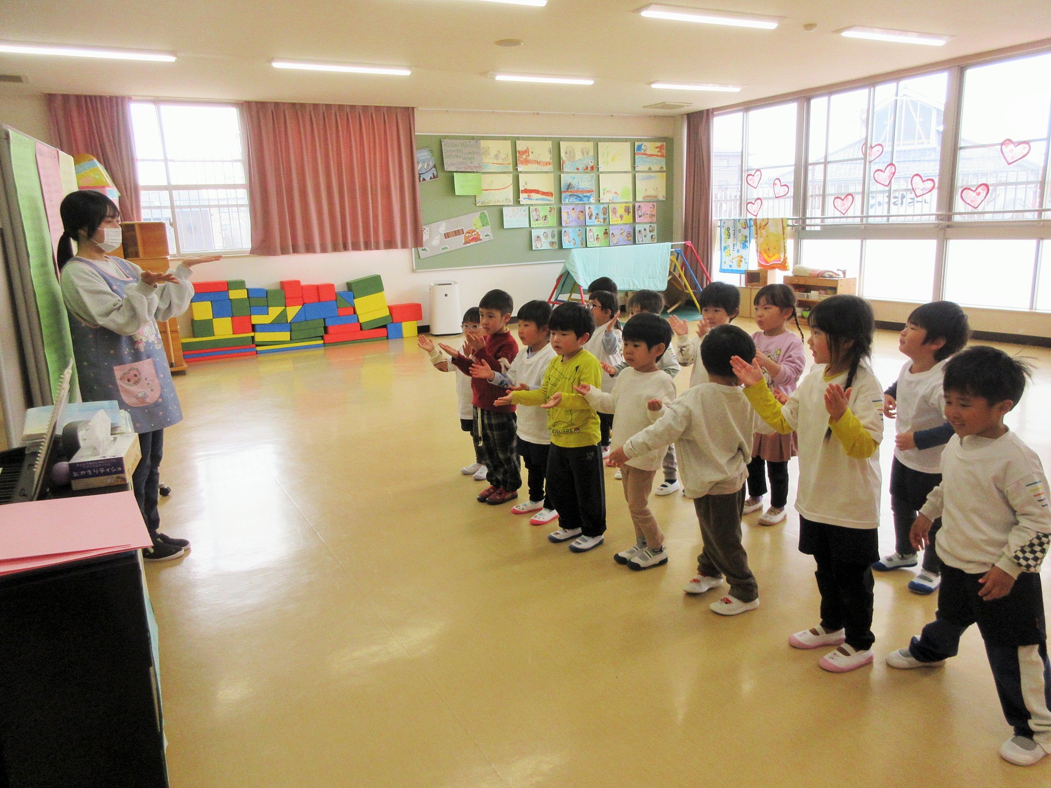 ○ 2月の予定 ○ 2日(月)安全点検・消毒日 3日(火)節分のつどい・豆まき 4日(水)リトミック指導日(予行練習) 7日(土)生活発表会(3・4・5歳児) 12日(木)魔法のビスケット(5歳児) 13日(金)避難訓練(火災 通報訓練) 16日(月)安全点検・消毒日 16・17日(月・火)身体測定 18日(水)運動教室(2・3・4・5歳児) 学校司書読み聞かせ(5歳児) 19日(木)味噌作り体験(4歳児) 20日(金)お誕生会 職員会議 24日(火)リトミック指導日(各クラス) 25日(水)令和8年度新入園児面接日 家庭保育協力日 ○ 3月の予定 ○ 5日(木)お別れ会 25日(火)卒園式 家庭保育協力日 |