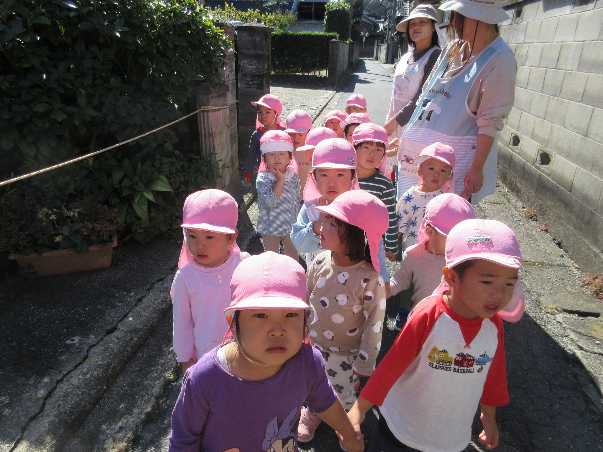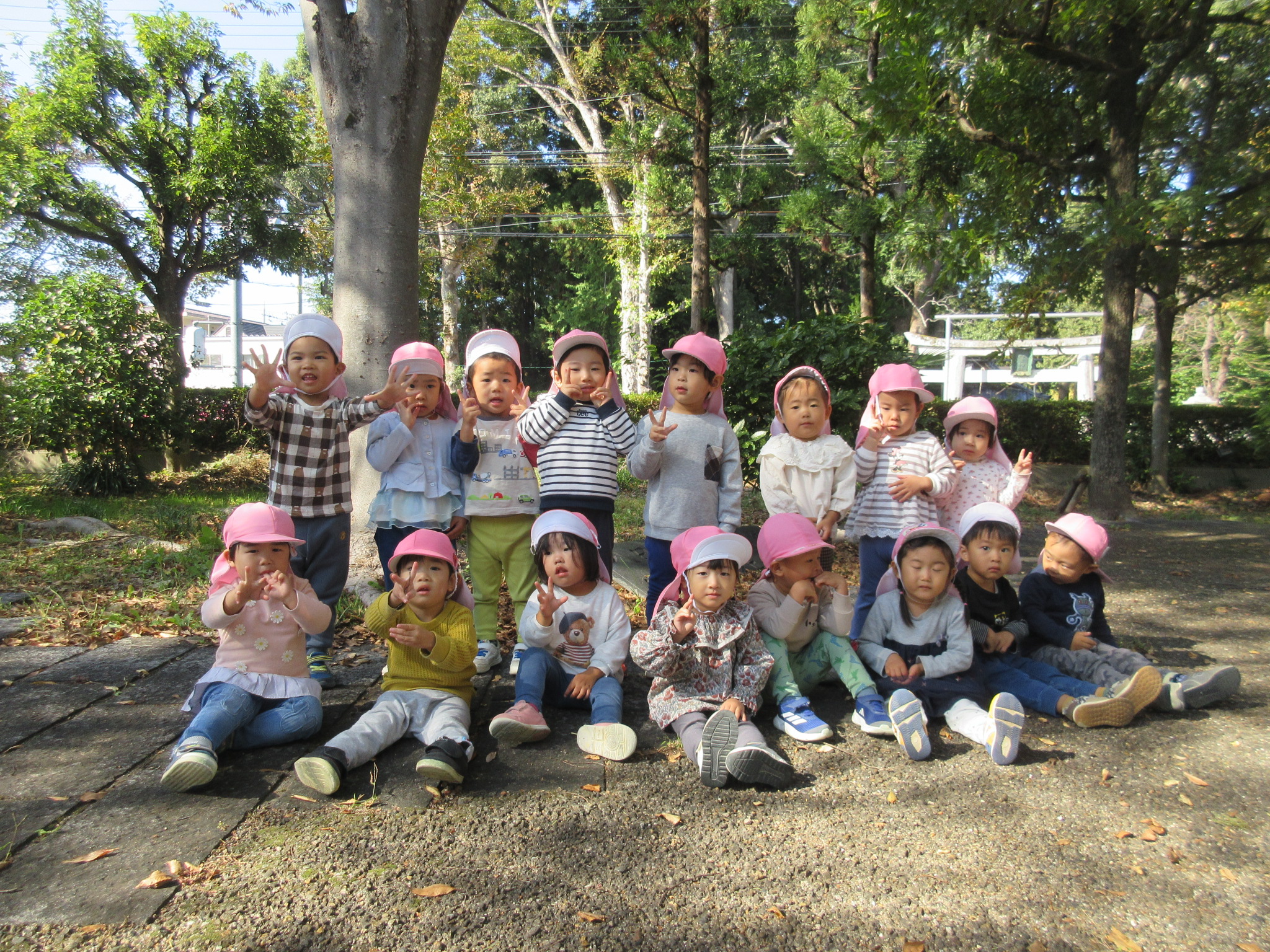 | 気持ちの良い秋晴れとなり、各クラス毎に出掛けました。5歳児は電車に乗って布施公園へ、4・3歳児はハートピアへ、2歳児は図書館へ、0・1歳児は園周辺や広場へ出かけました。お楽しみのお弁当は早い時間から「お腹空いた~!!」と待ちきれず、美味しくいただきました。 | ||